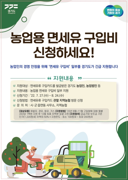 지원금은 농가에서 8월부터 11월까지 구입한 농업용 면세유(휘발유·경유·등유·가스)에 대해 월별 리터당 100원이 지급된다. 면세유를 구입한 다음달 내에 계좌로 입금된다.