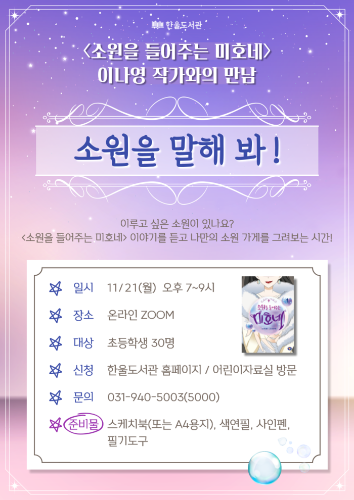 도서 전시에는 ‘소원을 들어주는 신비한 가게’를 소재로 담은 판타지 동화들이 전시되며, 전시 도서 중 ‘소원을 들어주는 미호네’의 저자인 이나영 작가를 초청해 작가와의 만남을 운영한다.