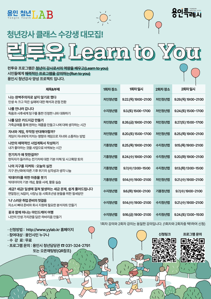 [로컬세계=김병민 기자]경기 용인특례시는 20일부터 다음달 27일까지 청년 LAB 3곳에서 청년 강사들이 준비한 강연을 선보인다고 19일 밝혔다.