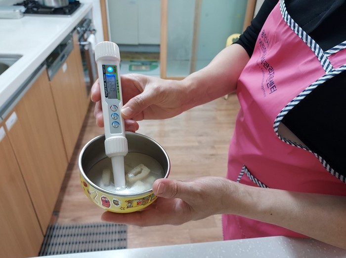 ▲염도계를 사용해 국의 염도를 확인하고 있는 모습. 용인시 제공 |