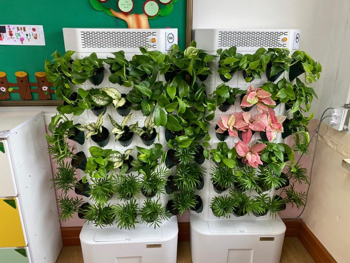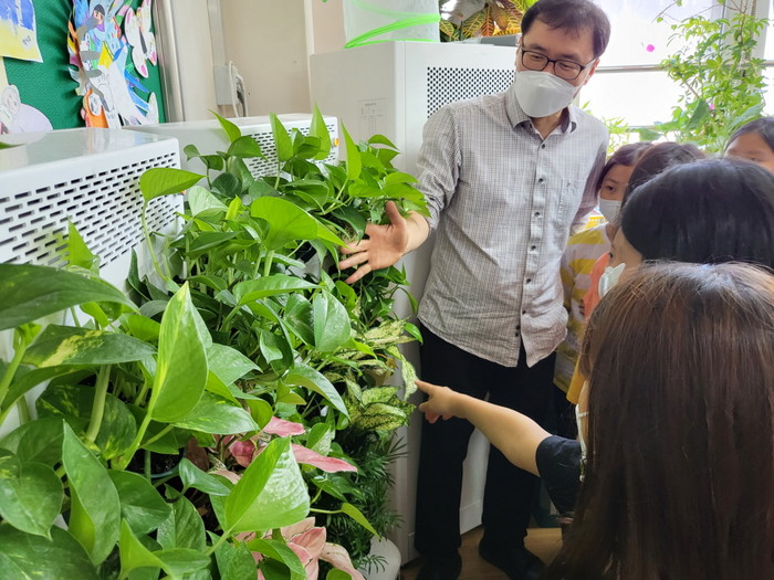 센터는 실내 수직정원을 통해 1개 교실 당 60본의 공기정화식물(스칸답서스, 테이블야자, 스노우사파이어 등)을 비치했다.