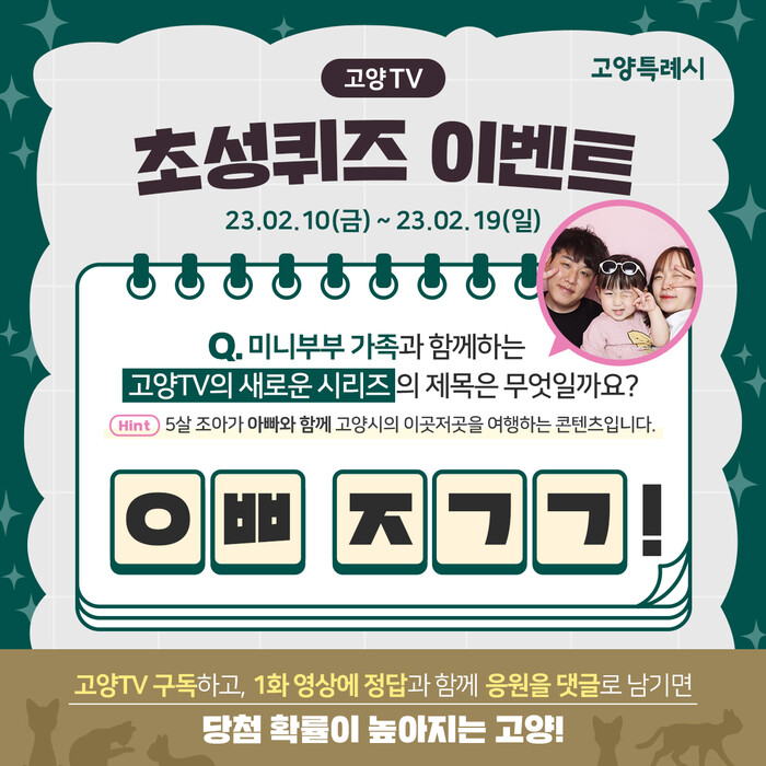 고양TV 채널을 구독한 후, 콘텐츠 제목 퀴즈를 맞히면 된다. 추첨을 통해 소정의 상품을 제공한다.