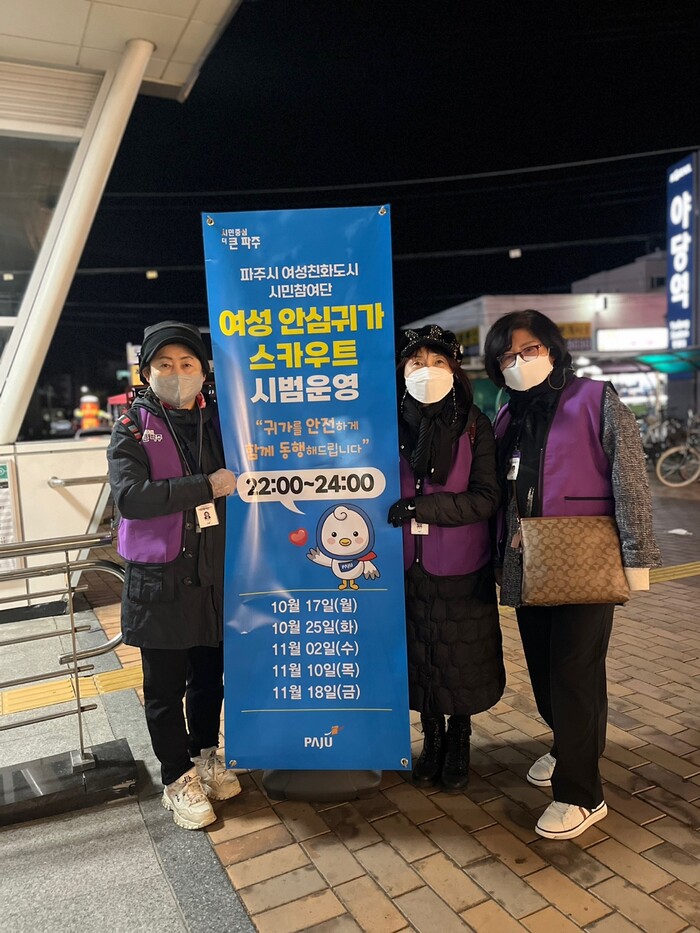 이번 시범 운영은 파주경찰서가 추천한 금촌로터리, 야당역 3번 출구, 문산터미널 일대의 야간 귀가 환경과 시민의 수요 등을 파악해 2023년 ‘여성 안심 귀가 스카우트’ 대상지를 선정하기 위해 기획됐다.