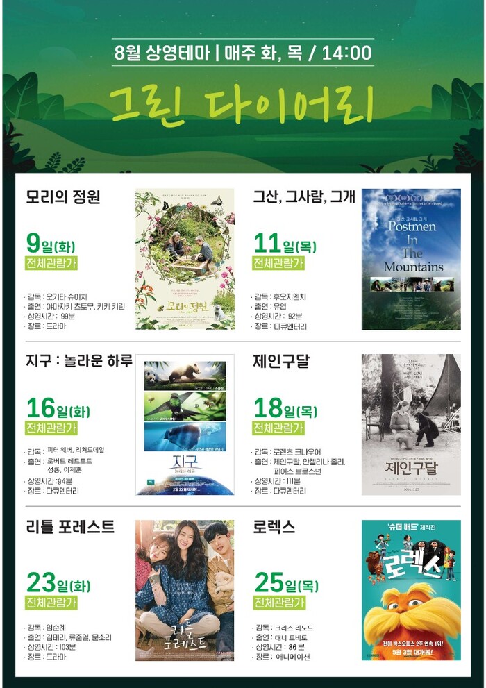 9일부터 매주 화, 목, 오후 2시에는 ‘그린 다이어리’를 테마로 ▲모리의 정원, ▲그 산, 그 사람, 그 개 ▲지구 ▲제인구달 ▲리틀 포레스트 ▲로렉스를 상영한다. 자연과 동물들을 소재로 한 영화를 보면서 힐링 받는 시간이 될 예정이다.
