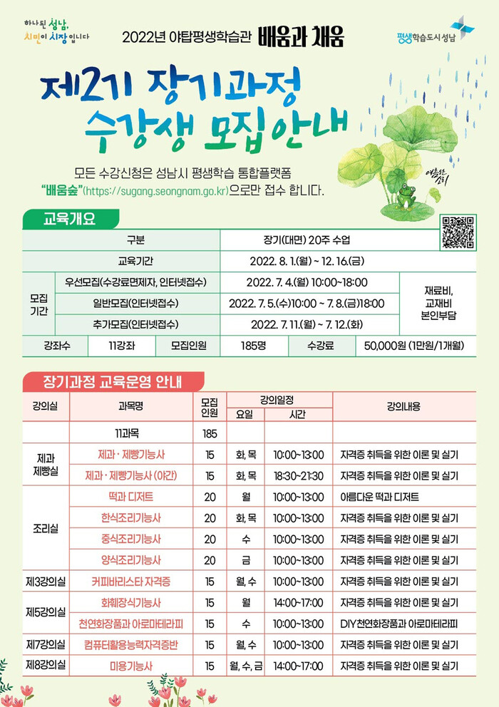 배움과 채움 과정을 수강하려는 18세 이상의 성남시민은 기간 내 성남시 평생학습 통합플랫폼 ‘배움 숲’을 접속해 선착순 신청하면 된다.