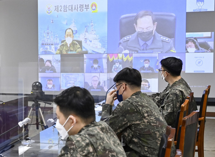 ▲25일에 실시한 꽃게 성어기 대비 유관 기관 화상회의에서 참석자들이 국민들의 원활하고 안정적인 조업 활동 보장 방안을 논의하고 있다.(사진=중사 홍석진) |