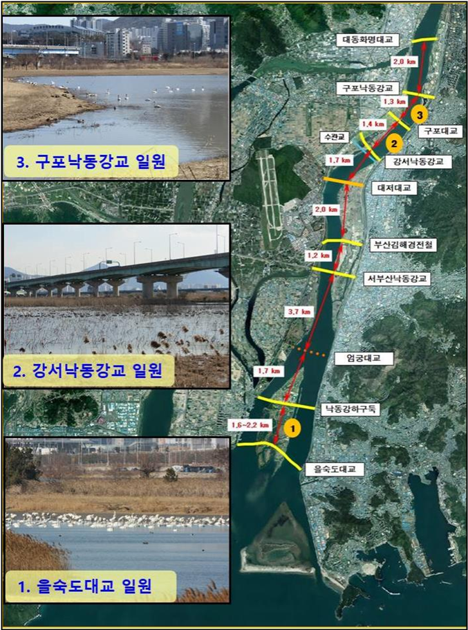 | ▲ 횡단교량간 간격 및 철새 도래 모습. 부산시 제공 |