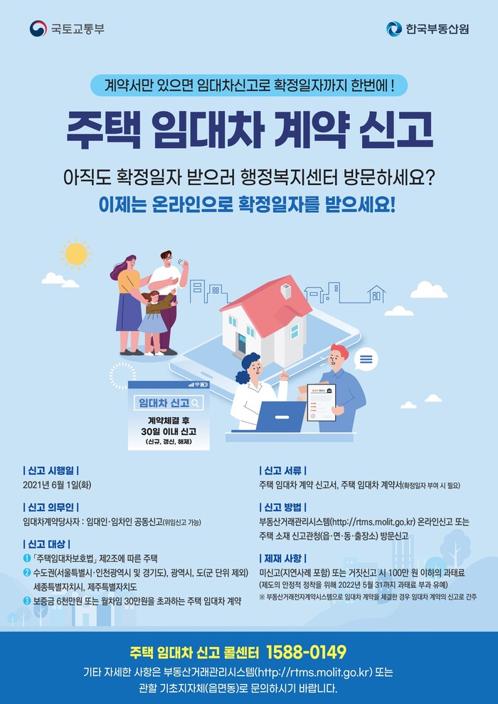주택 소재지 동 행정복지센터를 방문하거나 부동산거래관리시스템에서 신고하면 된다. 계약 체결일부터 30일 이내에 신고하지 않거나(지연사례 포함) 거짓 신고를 하면 100만 원 이하 과태료가 부과된다.