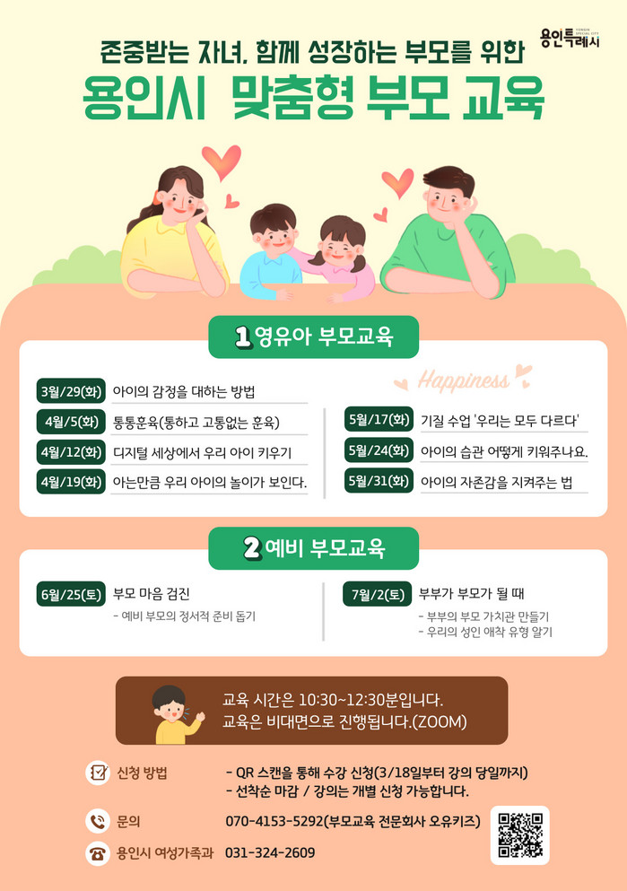[로컬세계 김병민 기자]경기 용인시가 오는 29일부터 7월 2일까지 ‘존중받는 자녀, 함께 성장하는 부모를 위한 용인시 맞춤형 부모 교육’을 진행한다.