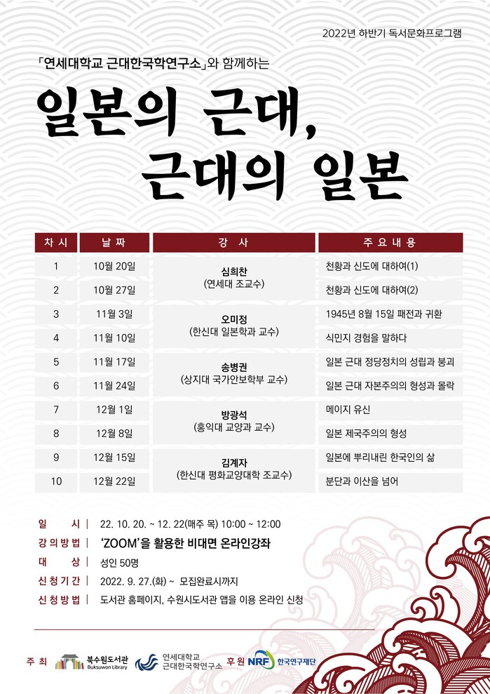 수원시도서관 통합예약시스템에서 ‘독서문화프로그램→(연세대학교 근대한국학연구소와 함께하는) 일본의 근대, 근대의 일본’을 선택해 신청할 수 있다. 성인 50명을 모집한다.