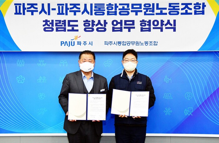 이상엽 파주시통합공무원노동조합 위원장은 “시와 노조와의 상생의 관계를 더욱 발전시켜 조직 내 부패행위를 근절하고, 내부고발자 보호와 직원 권익 보호 등 투명한 조직문화 조성을 위해 적극 협조하겠다”고 말했다.