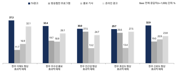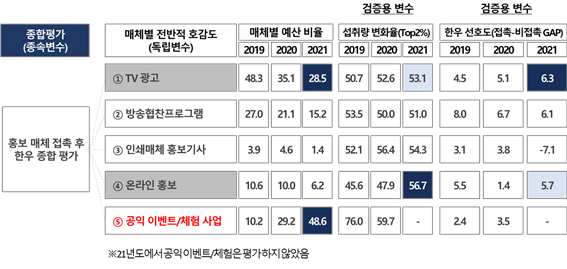 전반적으로 TV 광고를 통한 사업 홍보가 효과적일 것이라는 응답이 높게 나타났지만, TV 시청이 지속적으로 감소하고 유튜브 등의 온라인 시청 비율이 지속적으로 증가하는 것을 고려하였을 때 온라인 활동 강화가 필요한 것으로 나타났다. 더불어 온라인 홍보(유튜브 및 SNS)에서의 홍보 예산이 줄었음에도 그 효율성은 적지 않은 것으로 분석됐다.