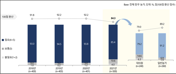▲농가가 인식하는 한우자조금의 필요도는 84.3점으로 전년 대비 감소하였음. - 대의원은 필요도 점수가 전년 대비 15.0점 감소한 79.0점으로 평가됨. |
