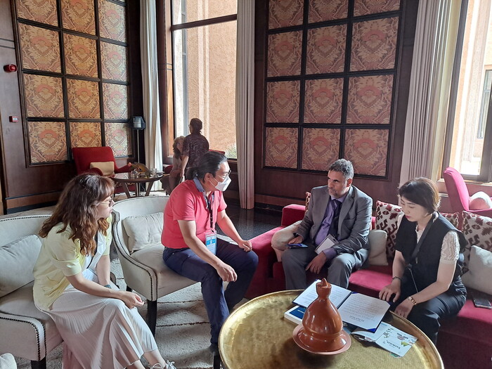 ▲유네스코 세계성인교육회의에 대표단으로 참석한 수원시 관계자들이 압드사마하만무드 모로코 국무총리실 산하 문맹퇴치센터장(오른쪽 두 번째)을 만나 업무협약을 제안하고 있다. |