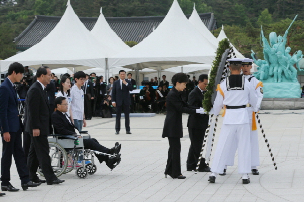 ▲ 박근혜 대통령이 지난 2013년 5월18일 광주 북구 운정동 국립 5.18묘지에서 열린 제33주년 5.18 민주화운동 기념식에서 헌화하고 있다.<사진출처=청와대 홈페이지> |