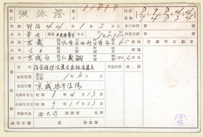 ▲홍영유 일제감시대상카드(서대문형무소 수감기록) |