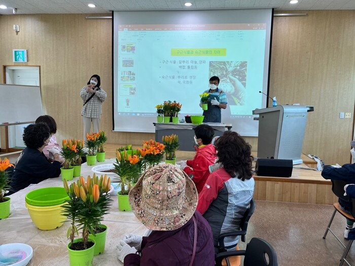 ▲농촌테마파크 체험 강사가 구근식물 심기 체험 강의를 하고 있는 모습. 용인시 제공 |