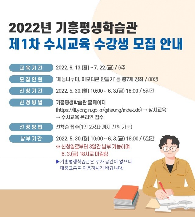 [로컬세계 김병민 기자]경기 용인시 기흥평생학습관이 제1기 수시교육 강좌에 참여할 80명의 수강생을 모집한다. 모집기간은 오는 30일부터 다음 달 3일까지로 선착순 선발이다.