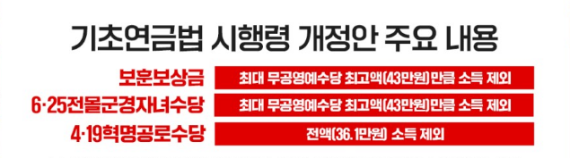 '기초연금법 시행령'이 개정돼 8월 1일부터 시행됨에 따라, 기초연금 수급 자격을 결정하는 소득인정액에서 국가유공자·독립유공자·보훈보상대상자의 보상금 중 최대 43만원을 비롯해 일부 수당이 제외된다.
