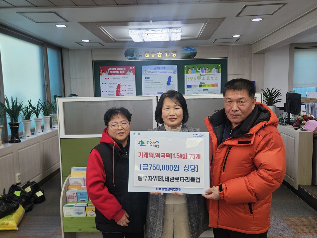 삼수동 행정복지센터는 지난 26일 황부자뷔페와 국제로터리 3730지구 5지역 태란로터리클럽으로부터 떡국떡과 가래떡 75개(75만 원 상당)를 전달받았다.