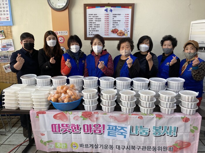 [로컬세계=박세환 기자] 대구 북구 관문동 바르게살기위원회는 지난 6일 팥죽, 물김치, 떡, 귤 등 정성 가득히 만들고 포장해 관내 소외되고 어려운 이웃(35세대)에게 전달했다.