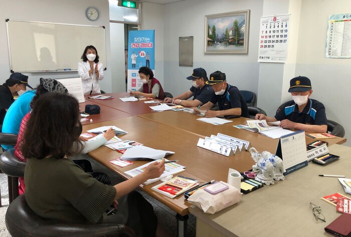 ▲기흥구보건소 관계자가 지난 25일 기흥구에 위치한 영통빌리지에서 '찾아가는 건강 경비대 교육'을 진행하고 있다. 용인시 제공 |