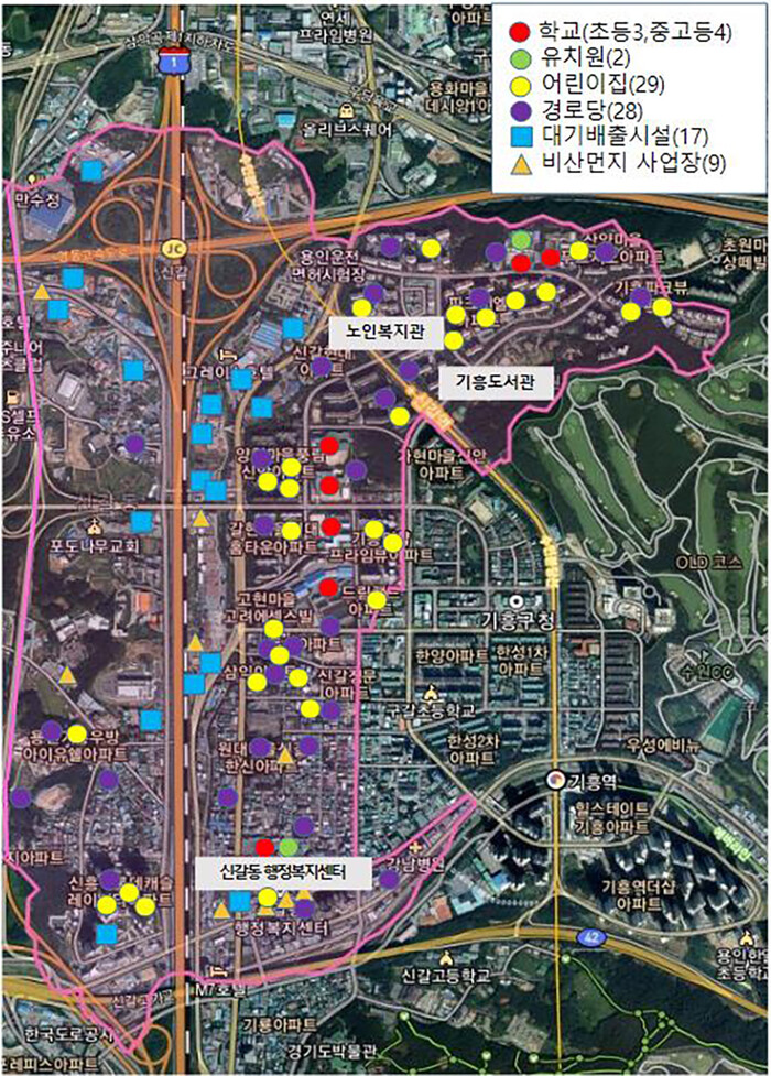 신갈동은 어린이집 29곳, 유치원 2곳, 초등학교 3곳, 경로당 28곳 등 취약계층 이용시설이 밀집한데다 경부고속도로 수원·신갈IC가 있어 교통량이 많은 지역이다. 또 이 지역엔 대기오염물질 배출 사업장이 17곳, 비산먼지 사업장이 9곳이 있다.