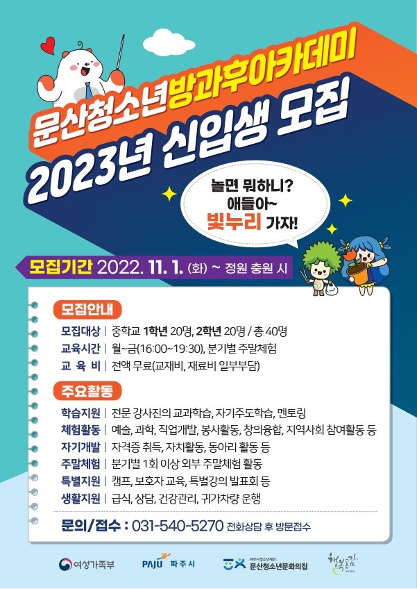 [로컬세계 = 이영원 기자]경기 파주시(시장 김경일)는 공공청소년수련시설인 문산청소년문화의집 청소년방과후아카데미 ‘빛누리’에서 2023년 신입생 총 40명(중학교 1학년 20명, 2학년 20명)을 모집한다고 15일 밝혔다.