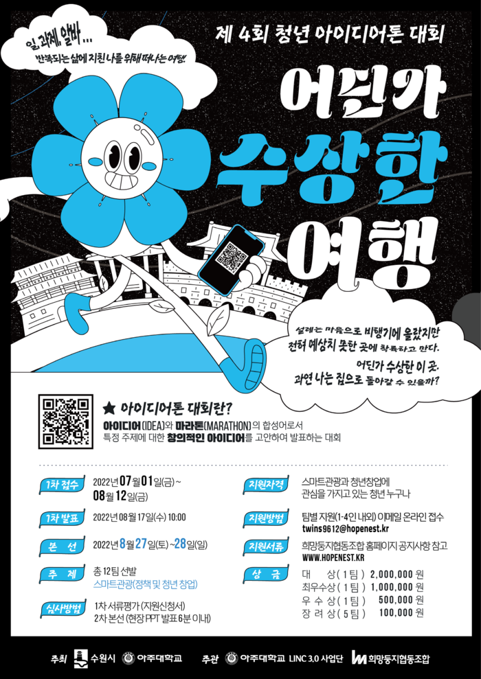 [로컬세계=김병민 기자] 경기 수원시와 아주대학교가 공동 주최하는 ‘제4회 청년 아이디어톤대회’에 참가할 청년들을 8월 12일 오후 6시까지 모집한다.