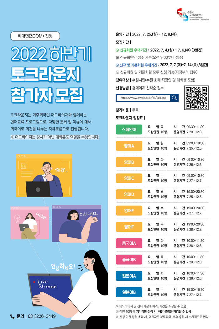 수원시국제교류센터 ‘시민참여’에서 ‘토크라운지 신청’을 클릭해 신청할 수 있다. 무료 프로그램이다.
