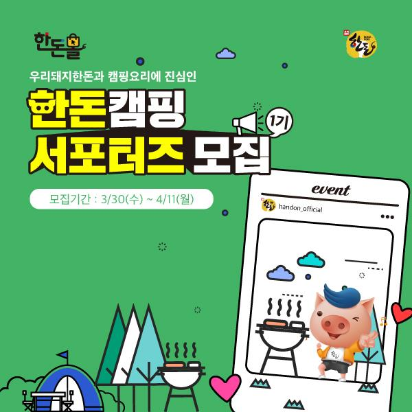 이밖에도 한돈몰에서는 지난 30일부터 4월 11일까지 월 2회 이상 캠핑을 가고 한돈 요리를 즐기는 캠퍼 12명을 선발하는 캠피그 서포터즈 모집을 진행 중에 있다. 서포터즈로 선발된 캠퍼는 캠핑장 예약비 10만원 지원, 한돈몰 마일리지 10만원 적립 및 한돈 캠핑 제품 지원 등 40여만원 상당의 혜택을 지원 받고, 총 3회 이상의 한돈 캠핑 요리 리뷰 등에 참여할 수 있다.