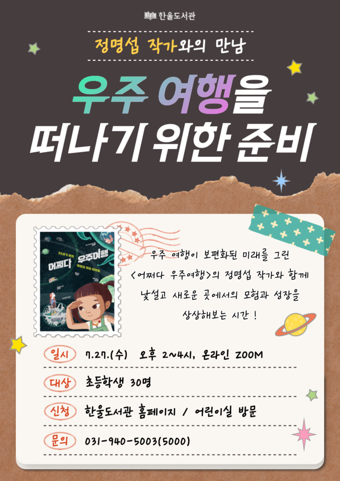 ‘어쩌다 우주여행’의 저자인 정명섭 작가는 분야와 장르, 동화와 소설을 넘나들며 작품 활동을 하는 작가로, 이번 강좌를 통해 현실에서의 우주여행에 대해 이야기하고, 이를 바탕으로 나만의 여행 이야기 창작 활동의 시간을 가질 예정이다.