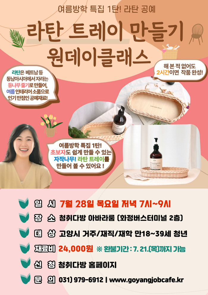 7월 28일 목요일에 진행되는 라탄트레이 원데이 클래스는 오는 7월 6일 수요일 오전 10시에 신청접수가 시작된다.