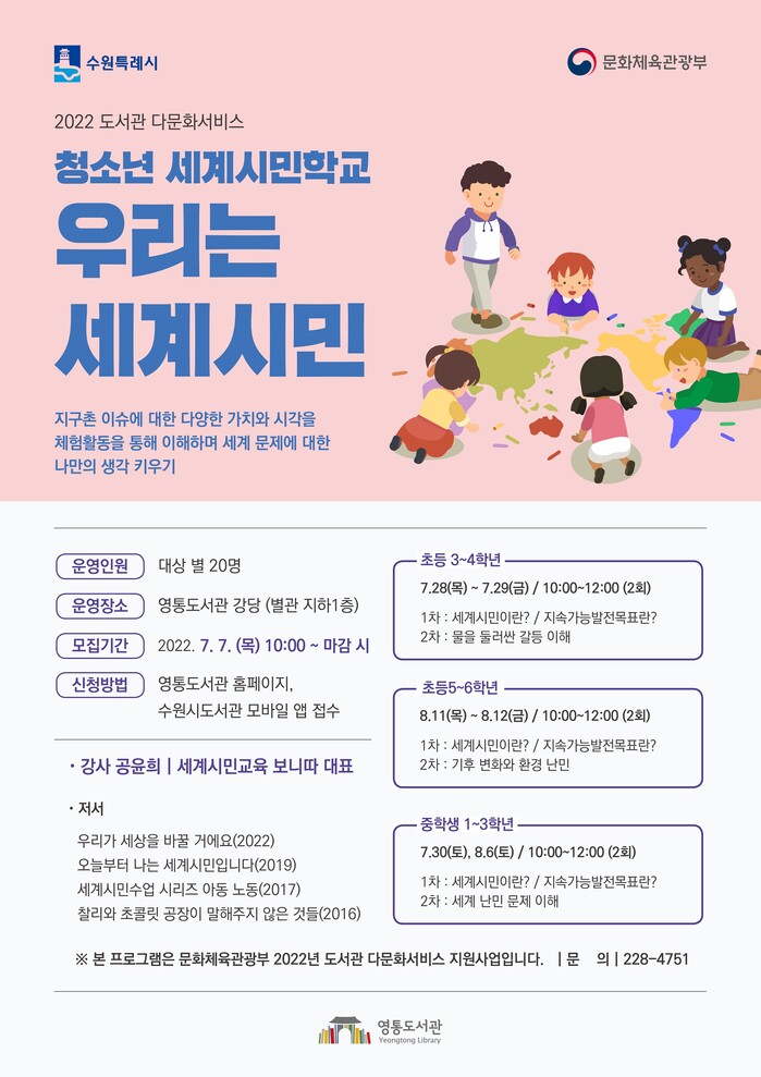 [로컬세계=김병민 기자] 경기 수원시 영통도서관이 청소년 세계시민학교 ‘우리는 세계시민’ 교육에 참여할 수강생을 7일 오전 10시부터 선착순으로 모집한다.