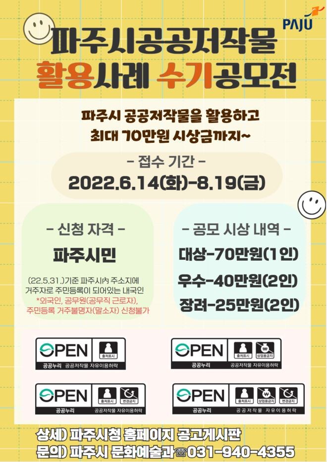 [로컬세계 = 이영원 기자]경기 파주시는 오는 8월 19일까지 ‘공공저작물 활용사례 수기 공모전’을 개최한다고 14일 밝혔다.