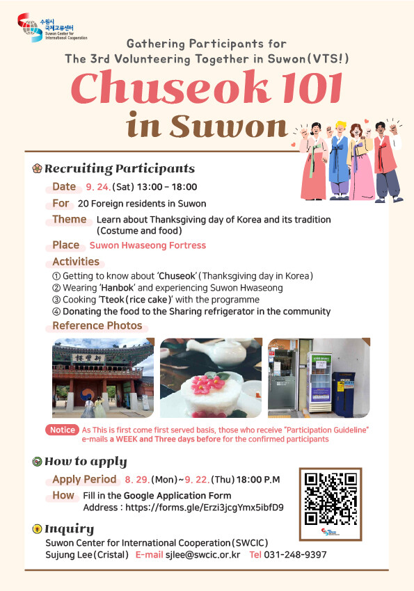 구글 링크나 모집 포스터에 수록된 QR코드를 스캔해 신청할 수 있다. 수원시국제교류센터 홈페이지 ‘센터소식→공지사항’에서 신청해도 된다.