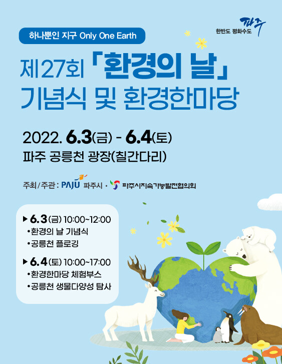 [로컬세계 = 이영원 기자]경기 파주시는 환경의 날(6월 5일)을 맞아 환경보전에 대한 시민참여와 공감대 확산을 위해 파주시지속가능발전협의회와 함께 오는 6월 3일부터 4일까지 공릉천 광장에서 ‘제27회 환경의 날 기념행사’를 추진한다고 30일 밝혔다.