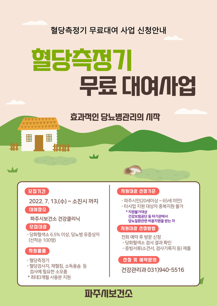 모집 대상자는 파주시 보건소로 전화 예약한 후 방문해 증빙서류(의사 소견서) 제출 또는 보건소에서 실시하는 당화혈색소 검사를 통해 선정한다.