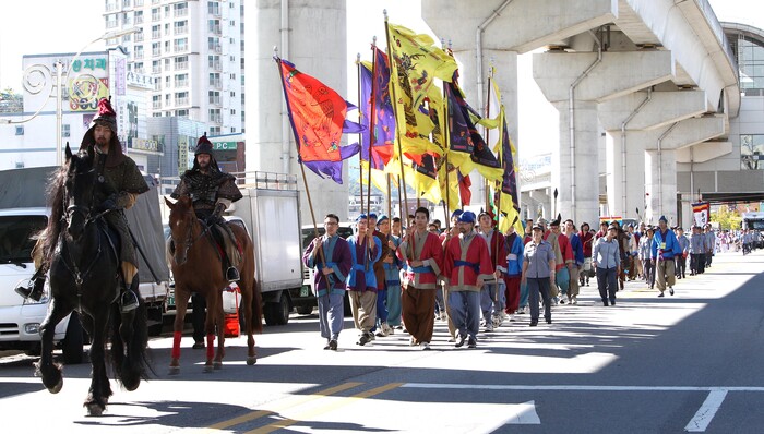 첫 주자는 고려시대 무장이다. 대몽항쟁의 승전 장수가 말을 타고 성화봉송 일정의 첫발을 내딛는다. 봉송 구간은 처인성~사장터다. 사장터는 처인성 북쪽 들판으로 지금의 처인고등학교 인근이다. 일설에는 몽고군의 적장 살리타이가 김윤후 장군과 처인부곡민들에게 사살된 곳이라 하여 사장터란 지명을 얻었다 한다.