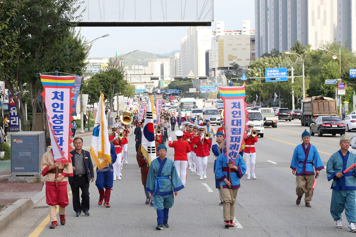 퍼레이드의 도착을 기다리는 용인시청에서는 용인시 향토무형문화재 할미성농악보존회의 할미성 농악이 시연된다. 장구잽이의 신명나는 가락과 춤사위를 보여주는 설장구, 어질어질 넘어질 듯 상모를 돌리며 공중에서 뛰며 도는 채상소고, 막대기 하나만으로도 물건을 빙빙 돌려대는 버나놀이, 그리고 열두 발이나 되는 종이 띠를 자유자재로 돌려대는 열두발상모가 흥을 북돋운다.
