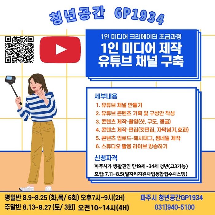 [로컬세계 = 이영원 기자]경기 파주시는 다음달 5일까지 청년공간 ‘GP1934’에서 1인 미디어 제작 초급과정 교육생 각 16명(주말반, 평일 저녁반)을 모집한다고 11일 밝혔다.