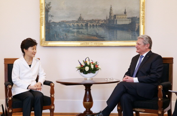 ▲ 박근혜 대통령이 지난해 3월26일 오전(현지시간) 독일 대통령궁에서 요하임 가욱 대통령과 회담을 하고 있다. <사진출처=청와대 홈페이지> |