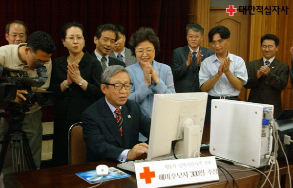 ▲ 지난 2005년 한완상 한적 총재가 컴퓨터로 제11차 이산가족상봉 1차 후보자 300명을 선정하고 있다.<사진출처 =대한적십자사 홈페이지> |