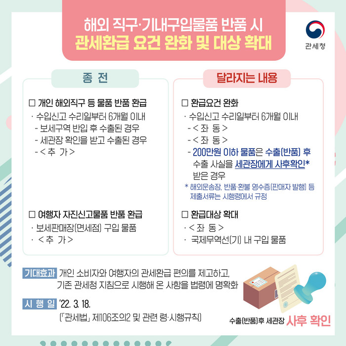관세청 관계자는 "이번 제도 개선으로 해외직구 소비자와 여행객의 편의를 제고하고, 납세자의 재산권이 한층 더 보호될 것으로 기대한다"고 밝혔다.