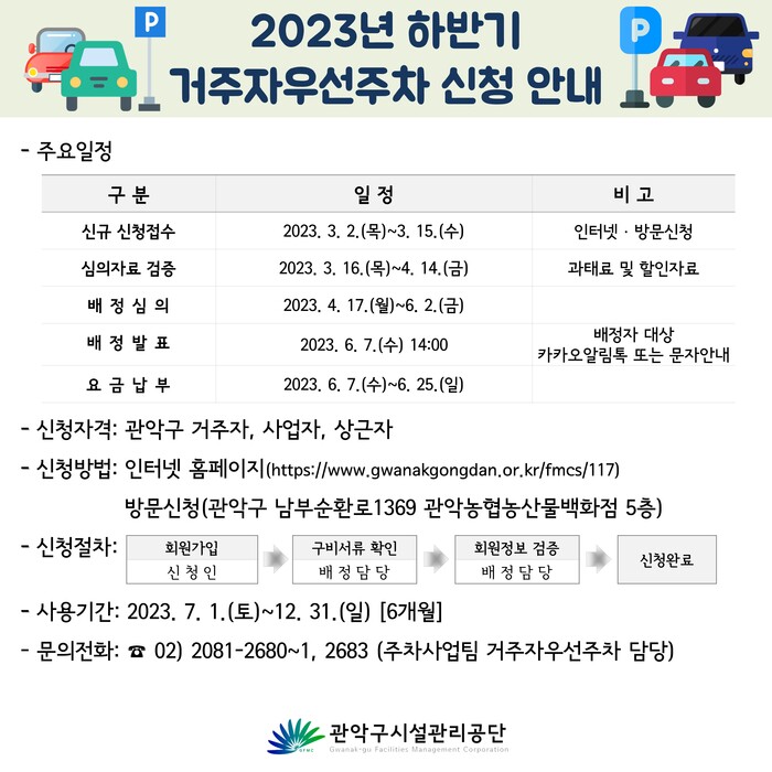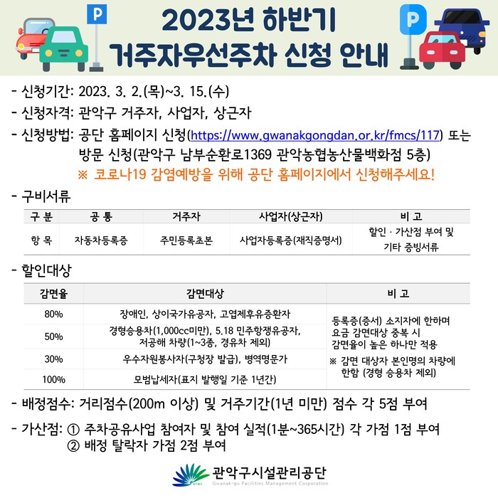 관악구시설관리공단이 3월 2일부터 3월 15일까지 2023년 하반기 거주자우선주차 사용신청 접수를 실시한다.
