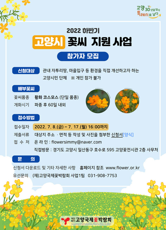 이어 2022년도 하반기에는 가을꽃의 대표주자인 황화코스모스 씨앗이 지원되며, 심을 곳이 부족한 지역일 경우 화분도 함께 지원해 고양시 곳곳에 꽃을 피울 예정이다.