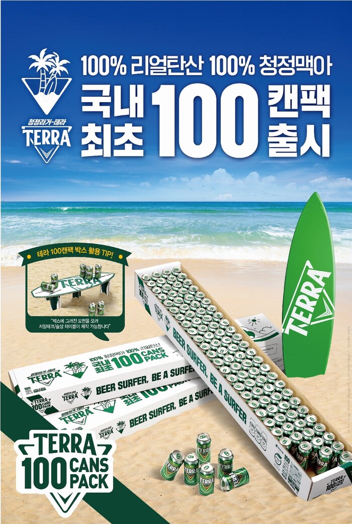 이번 초대형 기획팩은 테라 355ml캔 100캔으로 구성했으며, 가로 14cm, 세로 170cm의 초대형 크기로 상품 무게만 40kg에 육박한다. 기획팩 포장재는 서핑보드 모양의 맥주 테이블로 제작해 해변 등에서 활용할 수 있도록 했으며, 테이블 조립 방법이 포장재에 인쇄되어 있다.