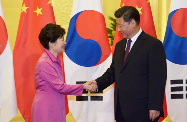 ▲ 박근혜 대통령과 시진핑 중국 국가주석이 지난 2일 오후 중국 베이징 인민대회당에서 한-중 정상회담을 위해 만나 악수하고 있다.<사진출처=청와대 홈페이지> |