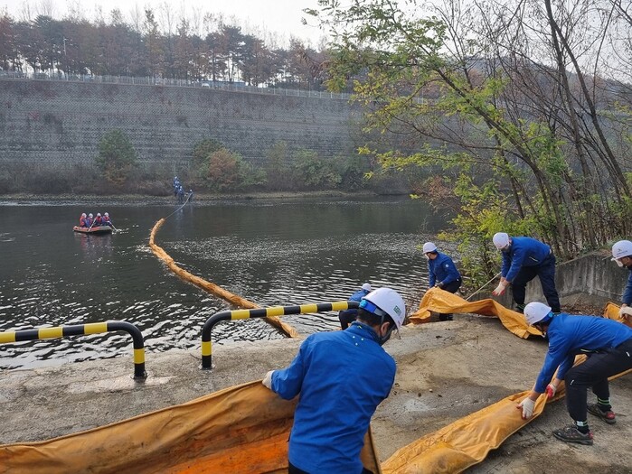훈련은 공공폐수처리시설 설비 중 고속응집침전지 시설 고장으로 인한 오일 유출 사고 상황을 가정해 진행됐다.