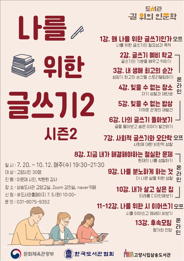 [로컬세계 = 이영원 기자]경기 고양시 삼송도서관에서 오는 7월 20일부터 10월 12일까지 삶의 기억을 글쓰기로 돌아보는 2022 도서관 길 위의 인문학 ‘나를 위한 글쓰기2 시즌2’를 진행한다.
